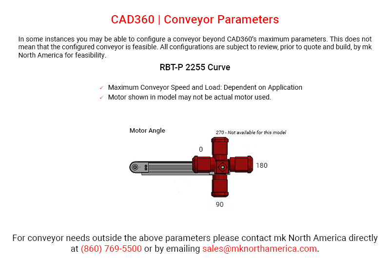 All conveyor models created using CAD360 are intended for reference only. For a formal approval drawing, please contact mk North America. Custom configurations are available. Contact mk North America at sales@mknorthamerica.com for more information.